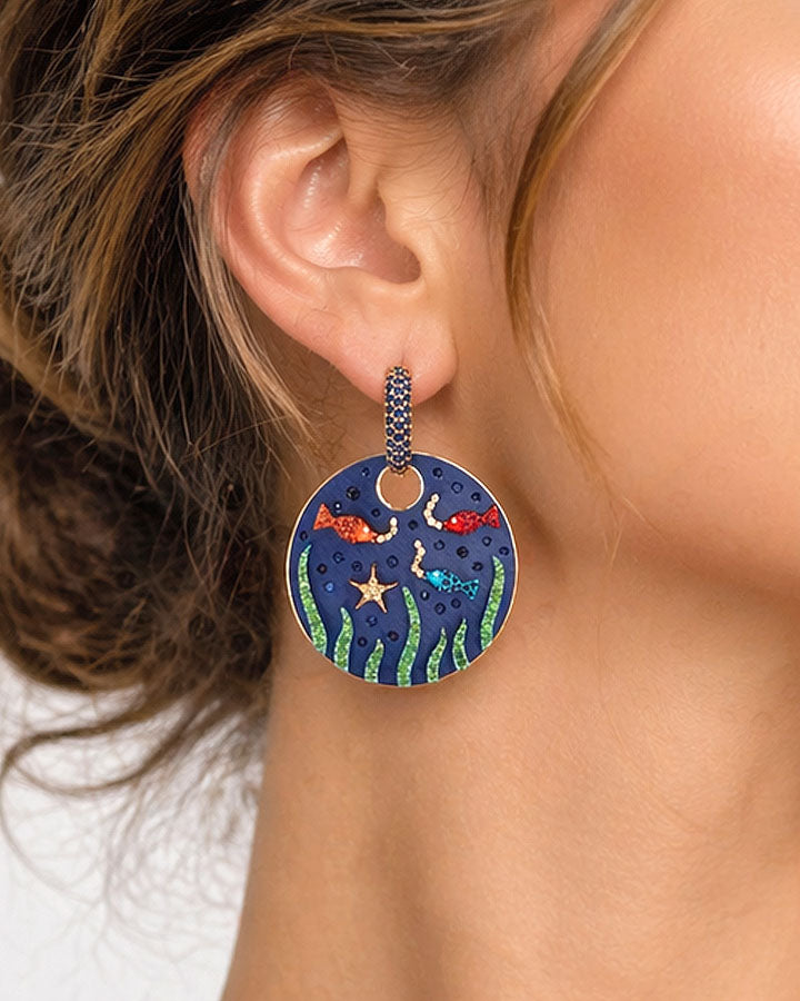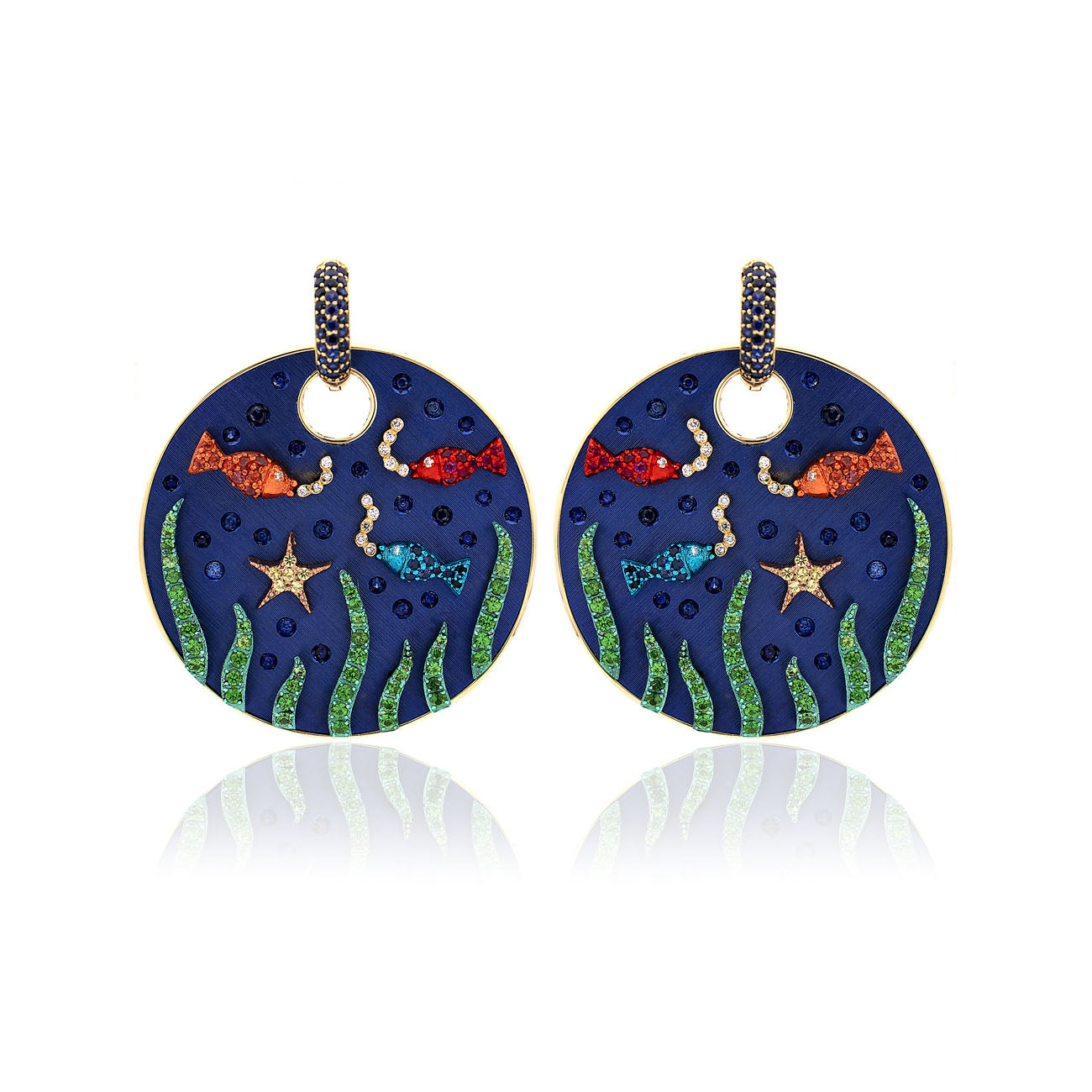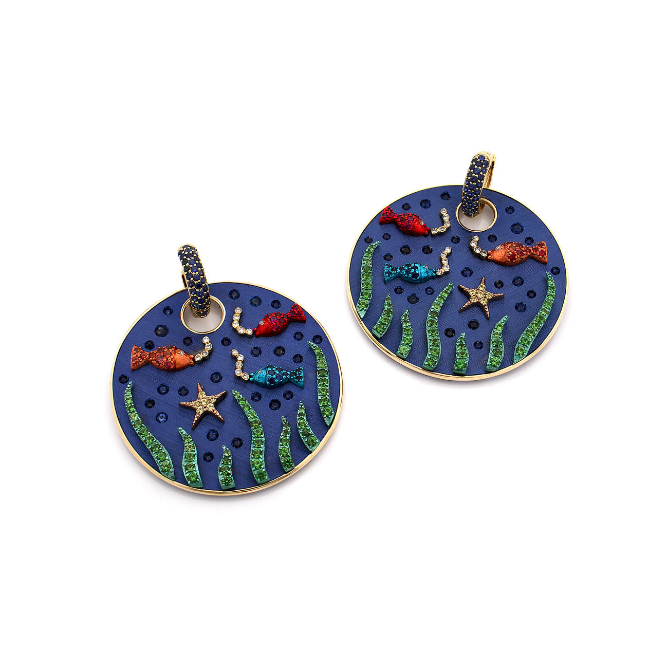Our “Italian Summer” earrings blend the beauty of the Mediterranean sea and night sky with 18kt gold, titanium and sapphires.
